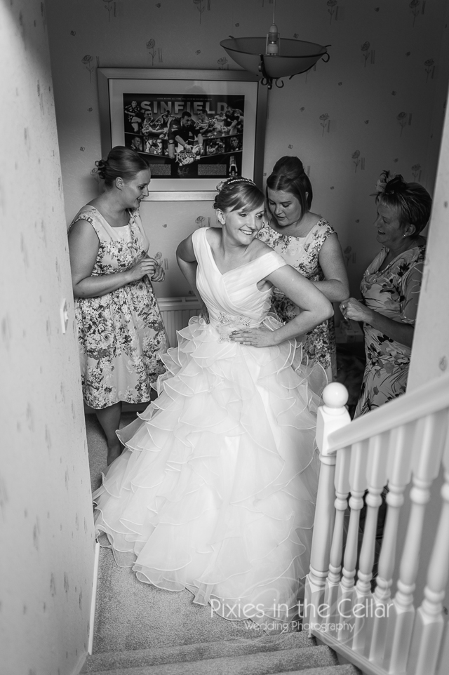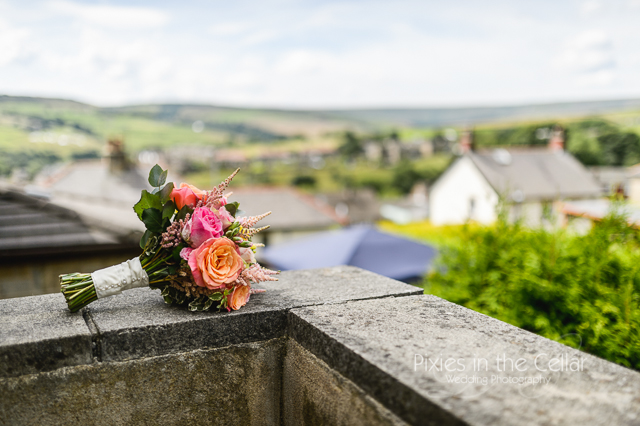 We were already quite familiar with Rachels family, as we’d shot here sisters’s wedding at The Saddleworth Hotel a couple off years ago. With four daughters in the family I guess mum and dad are quite happy that nearly all of them have tied the knot now! It was the weekend after the Tour d’France had passed through Holmfirth so the ‘tour’ bunting was still up in the garden and the view beyond of Holme Moss and the field art reminded us of a great weekend we’d had watching the tour and the great atmosphere of everyone!